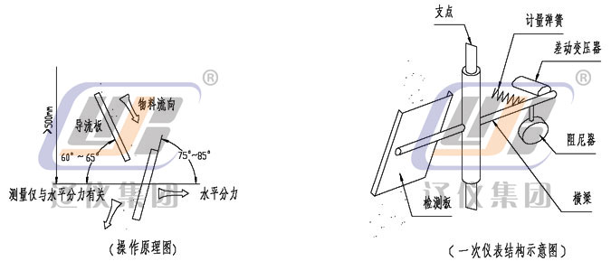 干燥的散裝固體物料自由落體沖擊到傳感檢測板(沖板)上后,傳感檢測板產生機械偏移。然后散裝物料流連續(xù)而無阻礙的通過。即:由于沖擊力與傳感檢測板具有一定角度,故該力分解成一個水平分力和一個垂直分力。垂直分力由變送器的機械結構克服而不起作用,而水平分力有一個差動傳感器(線性可調差動變送器),這個信號經(jīng)與之相連的積算儀檢測和處理,得出瞬時流量和累積流量。